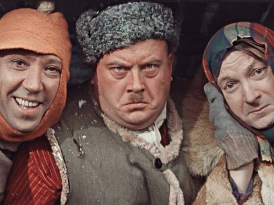 В гостинице в одной постели спят Вицин, Никулин и Моргунов. Утром они просыпаются.