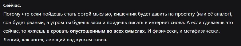 Потому что если пойдешь спать с этой мыслью, кишечник будет давить на простату (или её аналог), сон будет рваный, а утром ты будешь злой и пойдешь писать в интернет снова. А если сделаешь это сейчас, то ляжешь в кровать опустошенным во всех смыслах. И физически, и метафизически. Легкий, как ангел, летящий над куском говна.
