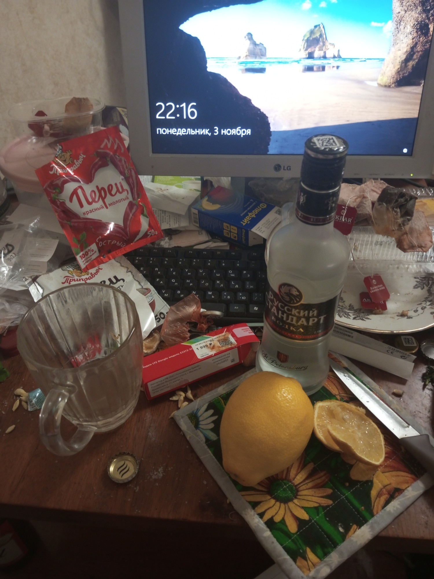 Ещë купил водочки. Деревеньки не нашëл, приобрëл русский стандарт, будем пробовать. Сейчас лежит в морозилке. Купил лимон на закусь, ещë фанту.