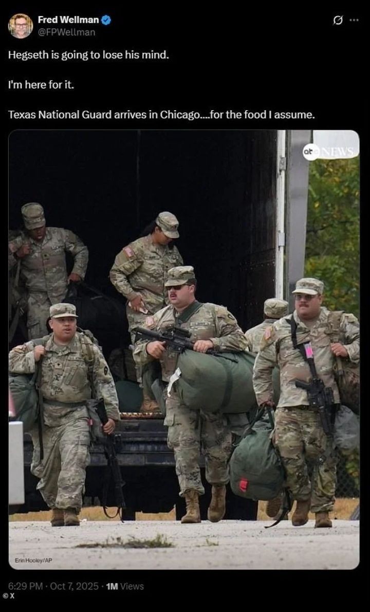 В Сети высмеяли фото толстых американских солдат. Вирусный снимок, сделанный журналистом AP 7 октября 2025 года, показывает весьма тучных военнослужащих Национальной гвардии Техаса, которые приехали в Чикаго для участия "в миссии по федеральной защите".