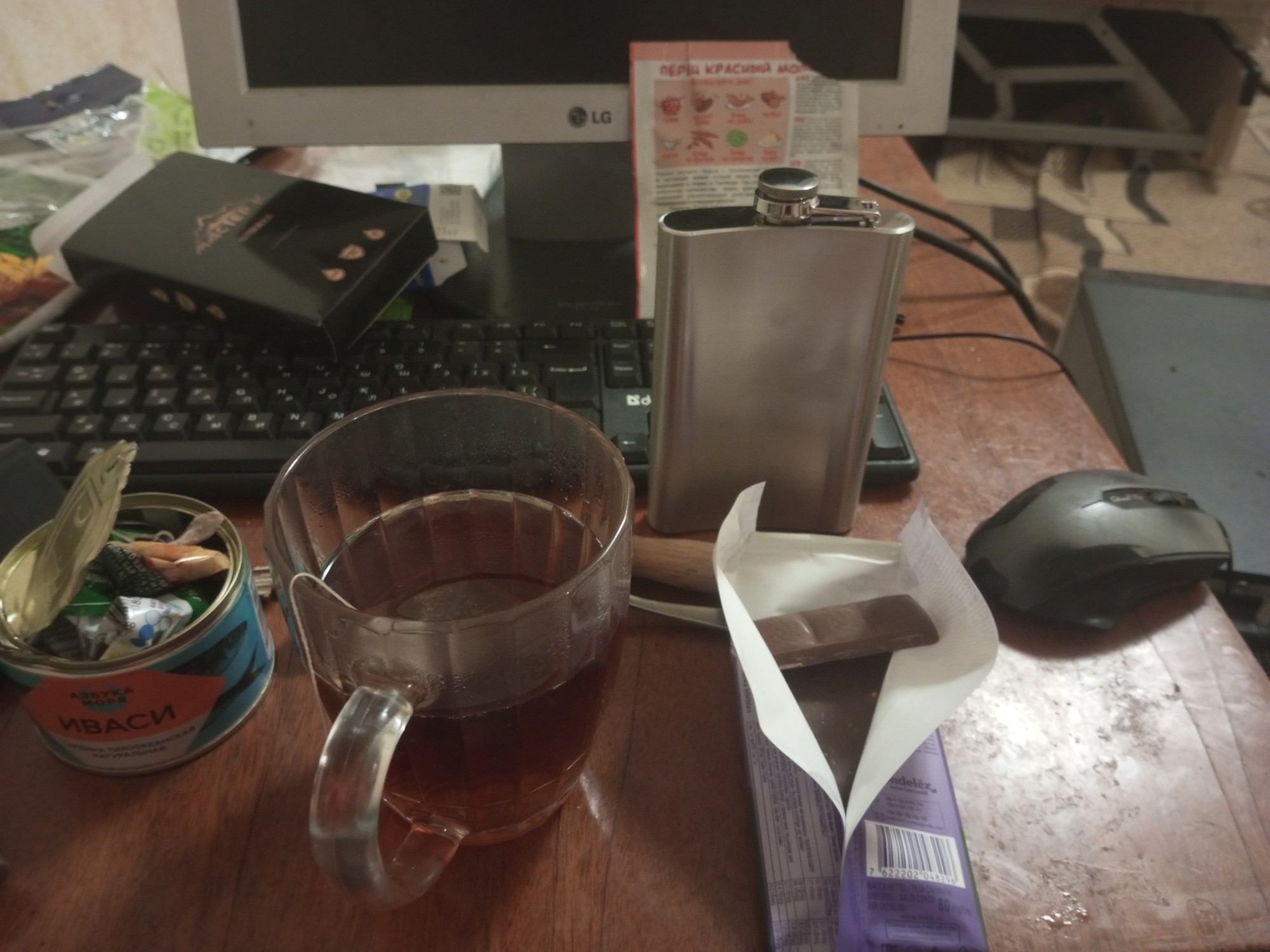 Пожрал сардины, в КБ стоит 90 руб банка, недорого в принципе. Там фосфор, так что иногда надо включать их в рацион. Ещë не проболелся, поэтому не бухаю и не буду, лучше попью чаю с шоколадкой, но заимел вот такую фляжку, не спрашивайте зачем.