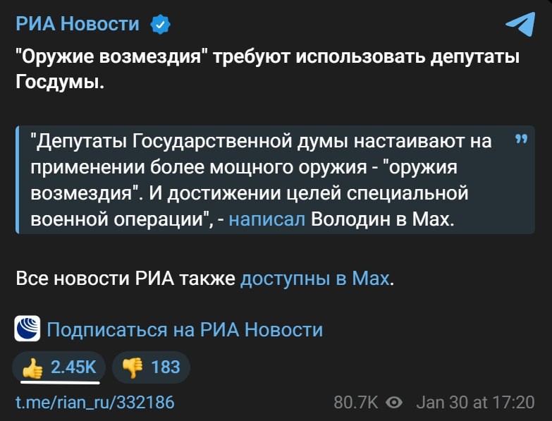 Аноны, а может кто пояснить за т.н. "Оружие возмездия" у РФ, это что? Я знаю, у немцев это были ракеты фау, а у РФ то что, орешник применяли, значит это не ОВ, а чего еще то? Оседлых псов отправят или что?
