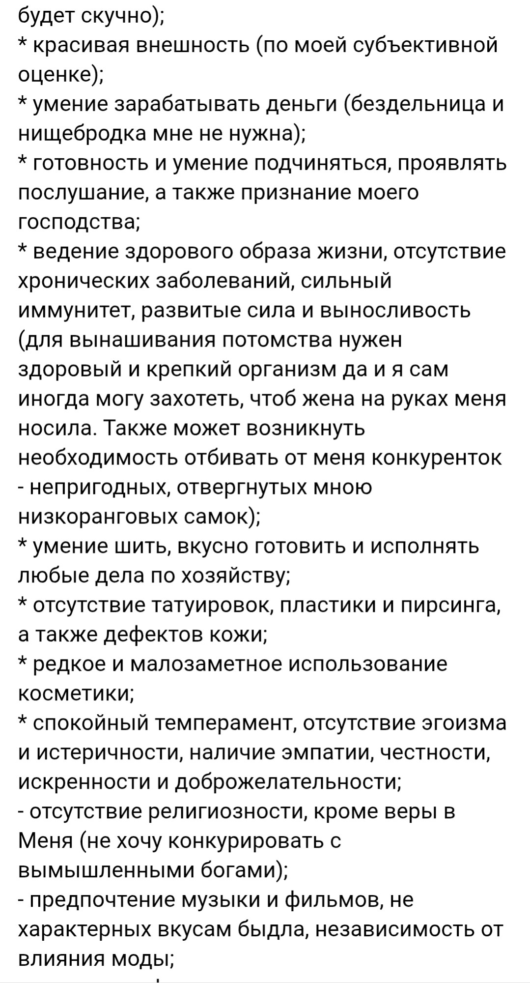 Сейчас мне немного некогда, но вечером с удовольствием сам перечитаю эти скрины. Думаю, они мне пригодятся для поисков новой спутницы жизни.