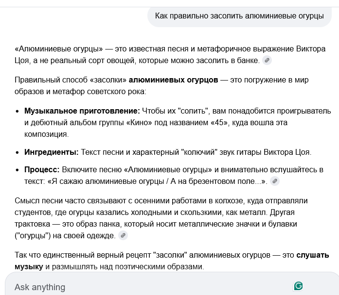 Спросил гуглошИИза, как засолить алюминиевые огруцы, он мне хуйню выдал