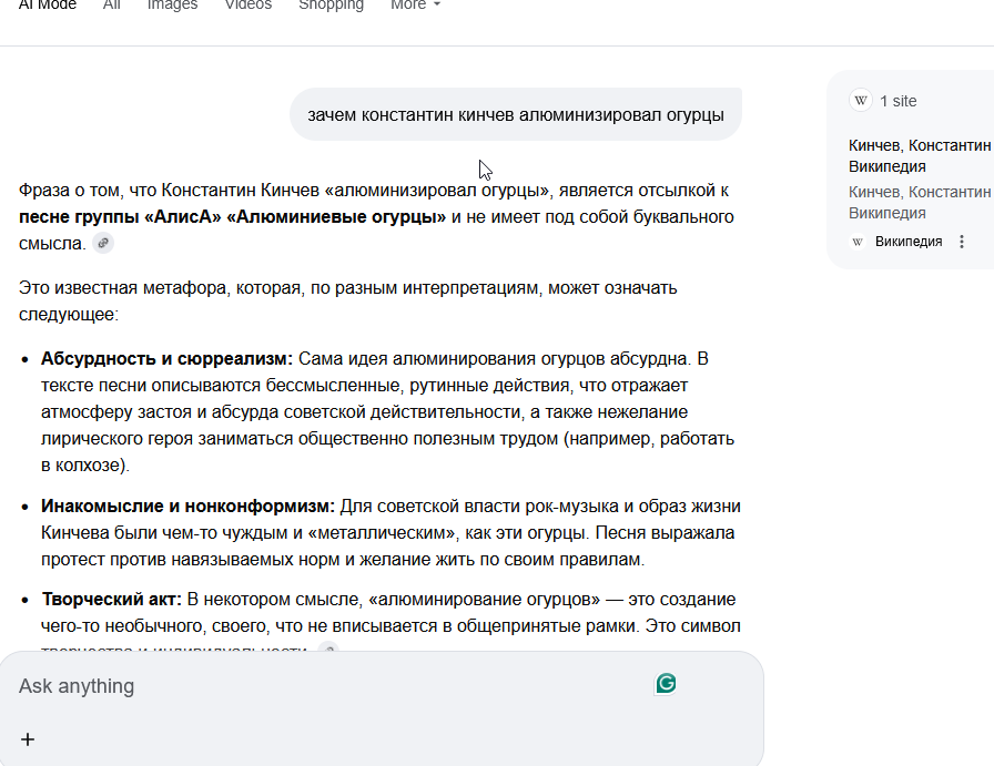 Фраза о том, что Константин Кинчев «алюминизировал огурцы», является отсылкой к