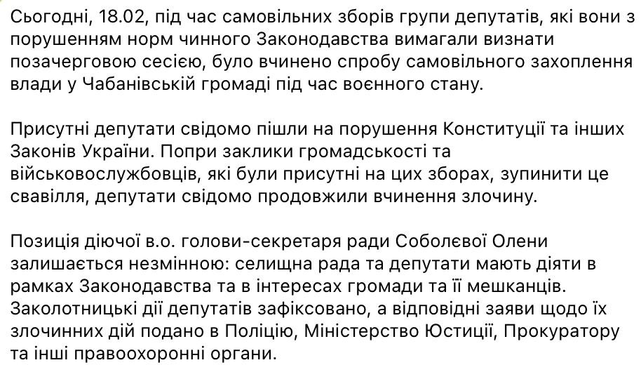 Местные депутаты сместили военную администрацию в селе Чабаны Киевской области. Военные пожаловались в полицию и украинскую прокуратуру.