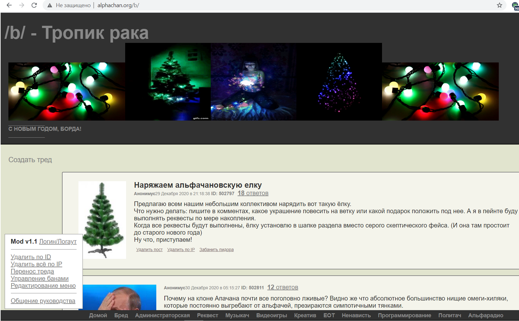 >>30308 кислотух переименовывал /b/ в Башню Трампа в прошлом году и ставил гифку с ним, когда Трамп проиграл выборы. А еще наряжал "елку" и прикреплял гирлянды под новый год.