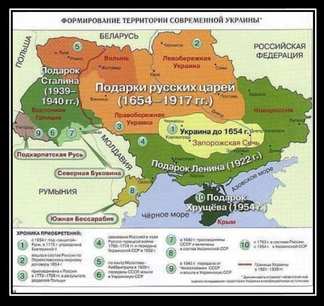 Все ватники - это двоечники. Такую же карту можно сделать по рф: Петербург - подарок шведов. Кавказ - подарок турков. Сибирь - подарок казаков Ермака. Калининград - подарок немцев. Тыва и Дальний Восток - подарок китайцев. Курилы - подарок японцев. Карелия - подарок финов и так далее.