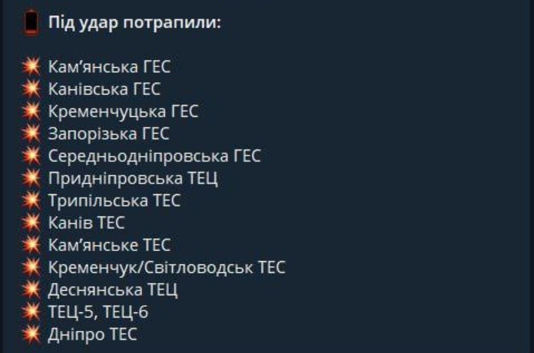 Список энергетических объектов на Украине пораженных сегодня ночью по версии противника