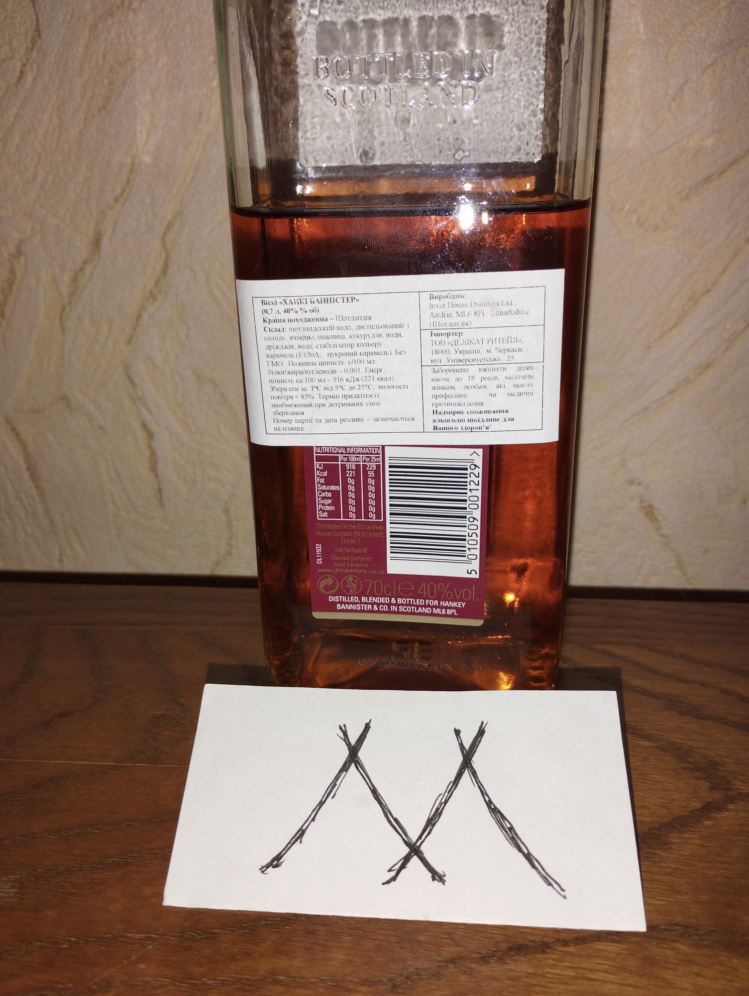 "Ханки Баннистер", ноль семь. В составе есть кукурузный спирт, да и выдержка в старых бочках из под бурбона. То есть по паспорту это скотч, а по сути - почти бурбон. Я вот думаю: если вата рвалась из-за всякой висковой мелочи, то от этой бутыли она же вусмерть разорвётся?