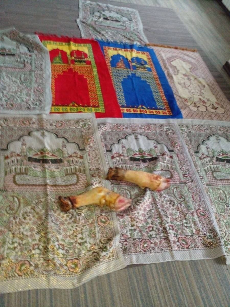 Мужчина вошёл в молельную комнату, достал из пакета свиные ножки и разложил их на ковриках, после чего ушел. Прихожане пришли в психологический раздрай, как только увидели харам.