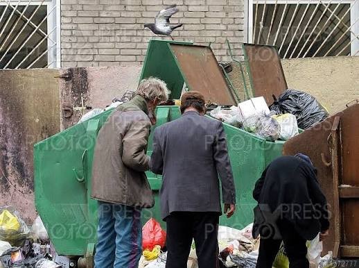 The image shows three people and a pigeon searching through a large green dumpster filled with trash. The photograph was taken in Kiev, Ukraine, on October 6, 2010.