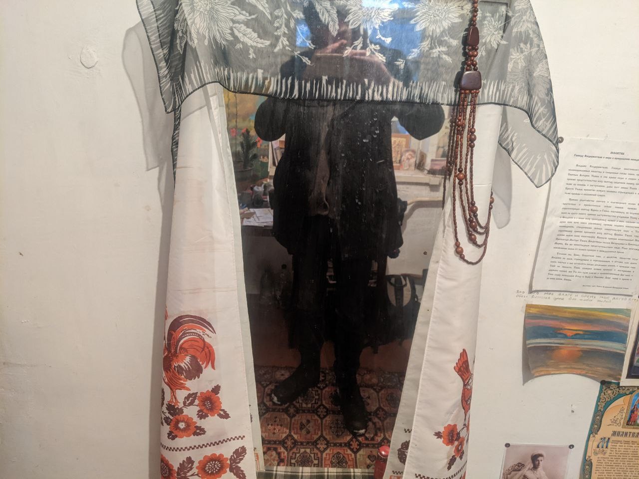 Знаменитое полотенце с петушками и хаотично расклеенные листы с молитвами на стенах. Позади за шторами прячется бомжеватого вида молодой человек с заметной худобой в щеках. Не подскажете кто это может быть.