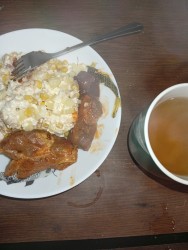 Мой ужин перед завтрашней работкой, надо сил набраться. Крабовый салат, тушёная свинина и зелёный чай.