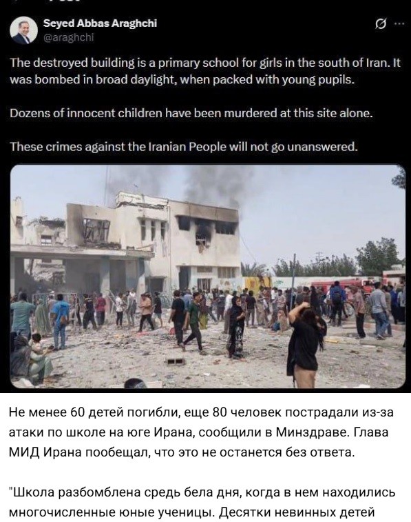 "Школа разбомблена средь бела дня, когда в нем находились многочисленные юные ученицы. Десятки невинных детей убиты. Эти преступления против иранского народа не останутся безнаказанными", — написал Аббас Аракчи.