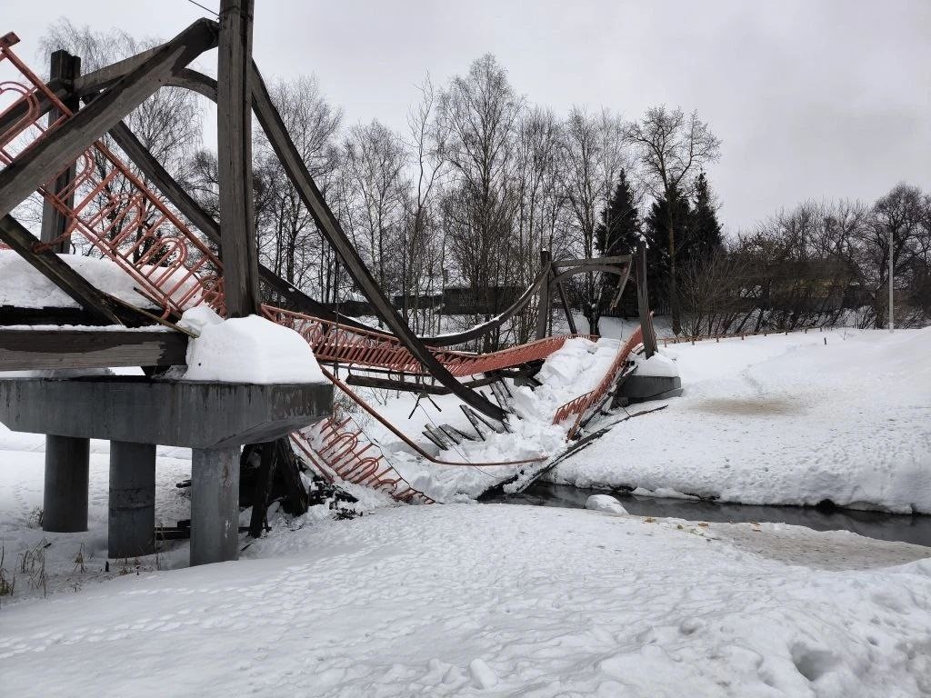 Пешеходный мост в Нахабино рухнул под весом снега и мочератора.