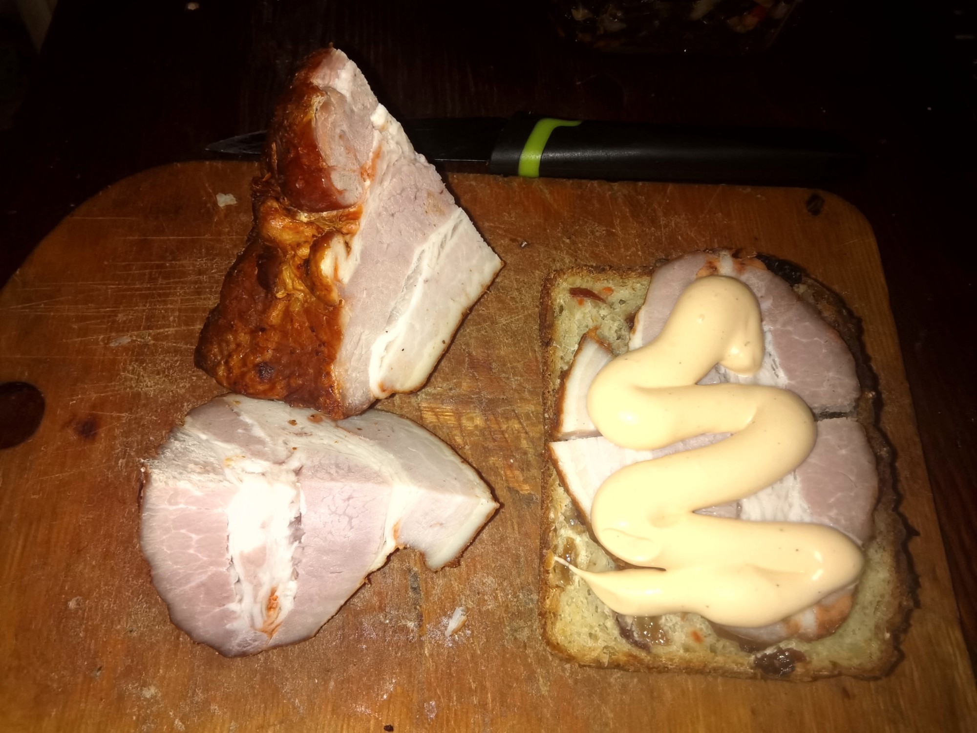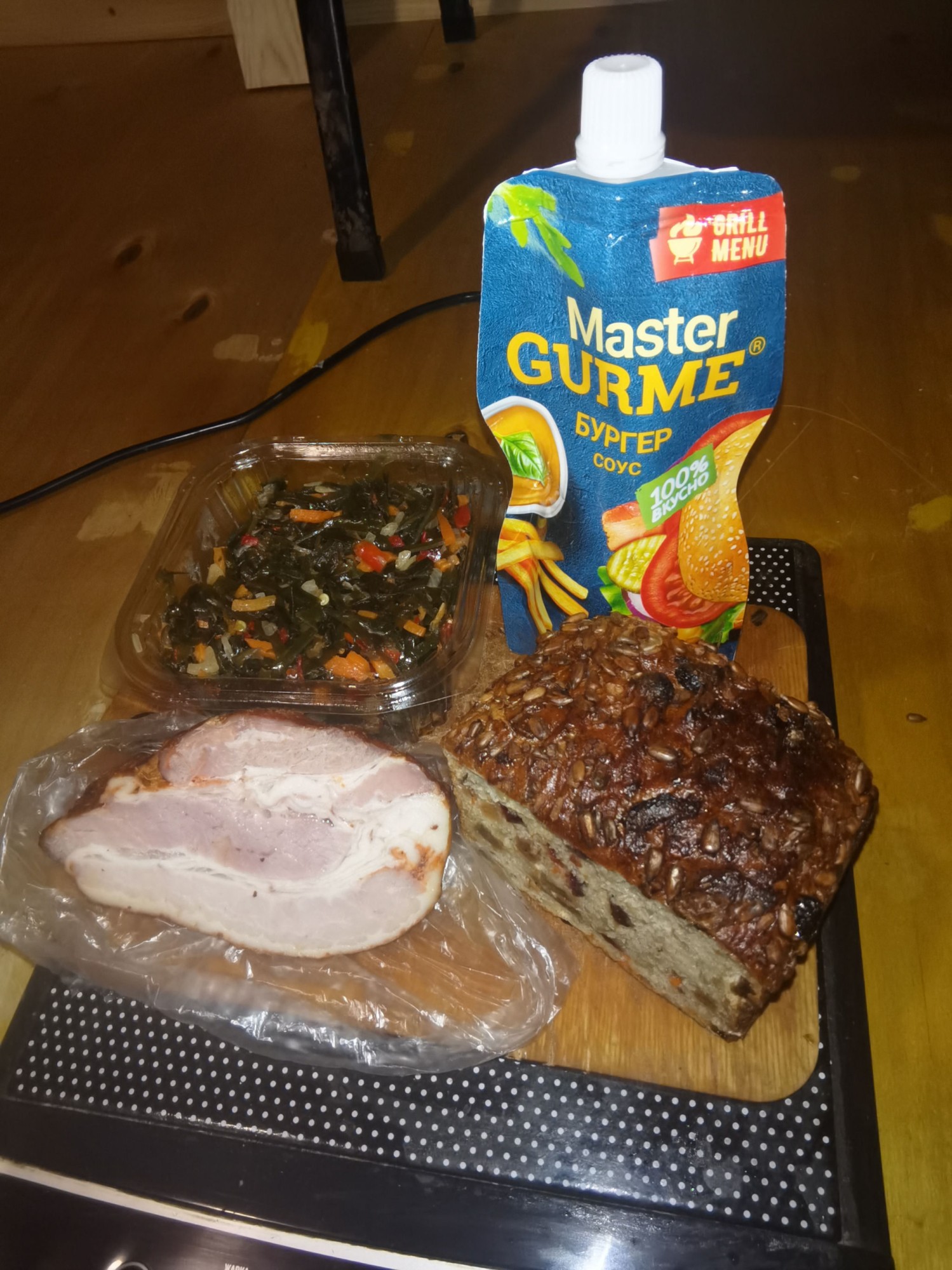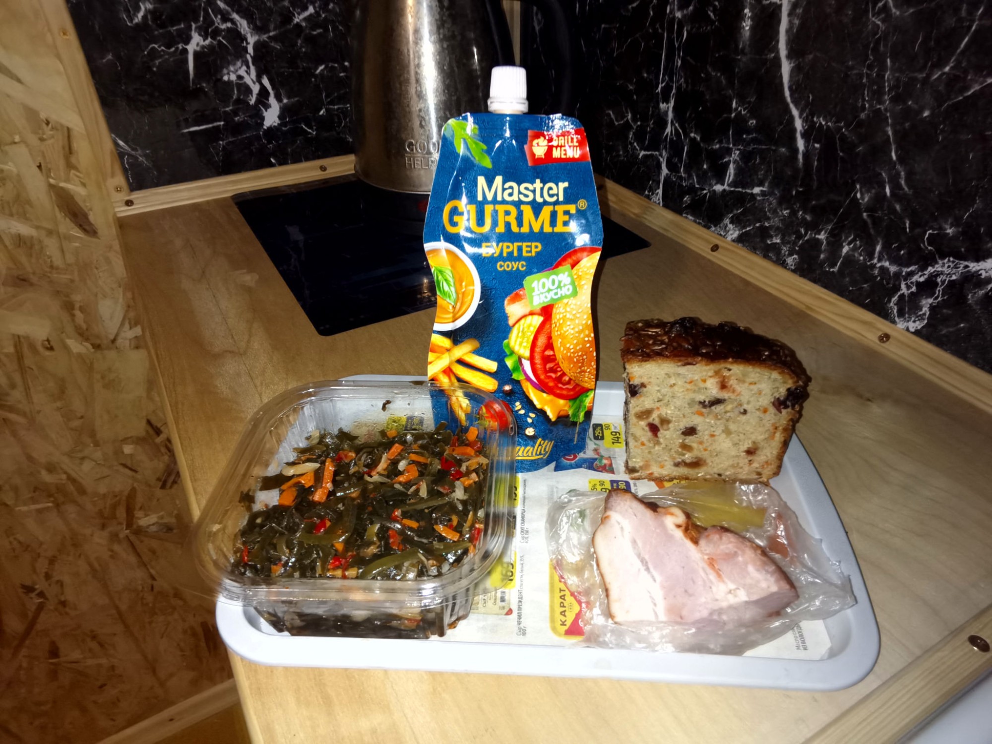А я купил самый дорогой фруктовый овсяный хлебушек, 360 рублей за килограмм, этот кусочек на 130 рублей. Взял грудинку варенокопченую, очень вкусный соус. Морская капуста, по акции 25 рублей за сто грамм.