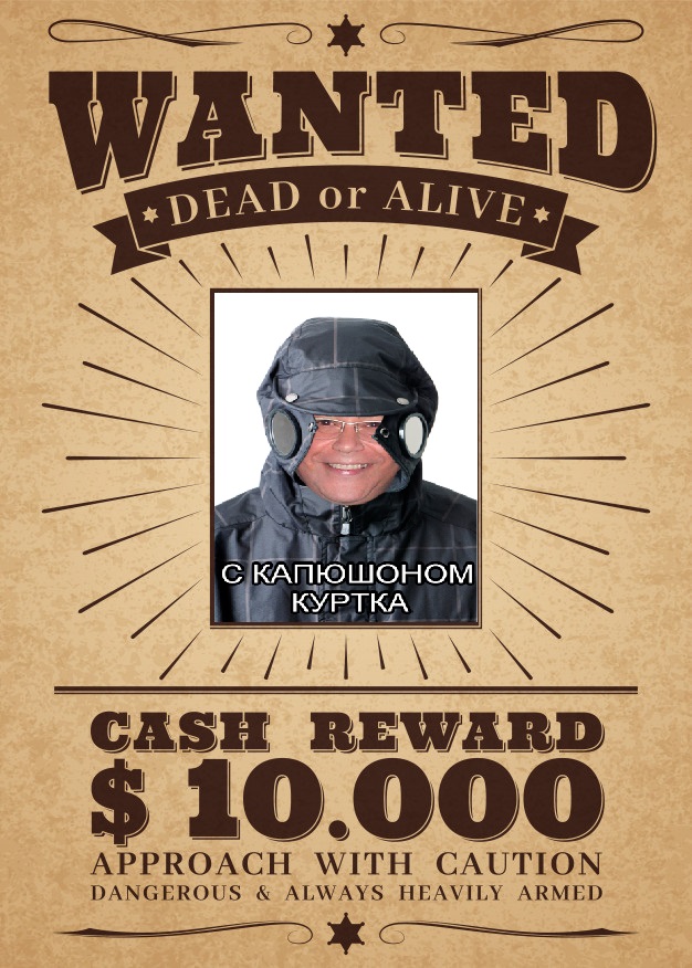 Разыскивается особо опасный преступник, который ограбил магазин одежды.Последний раз он был одет в куртку с капюшоном!За информацию о местонахождении грабителя будет выплачено вознаграждение!