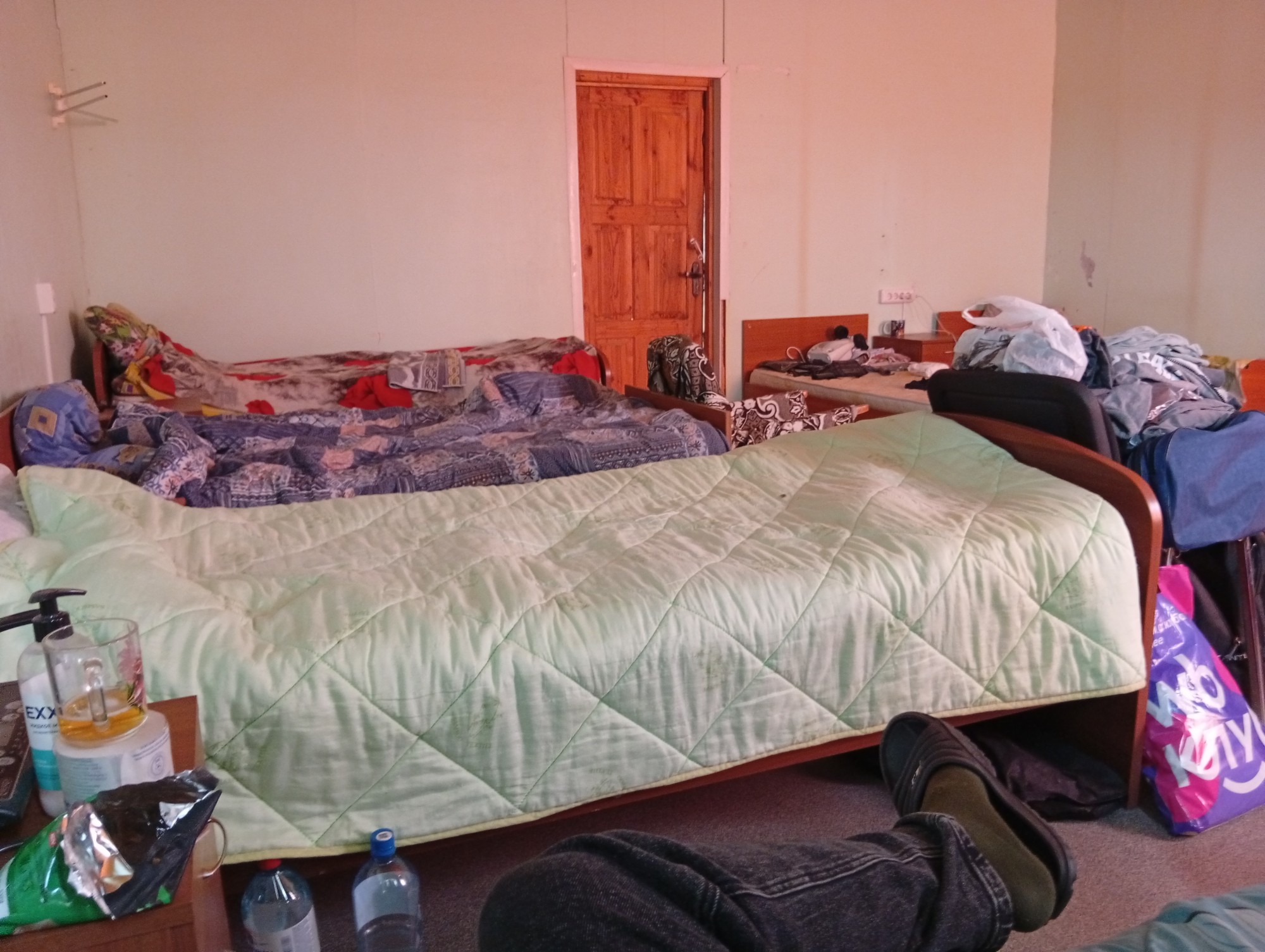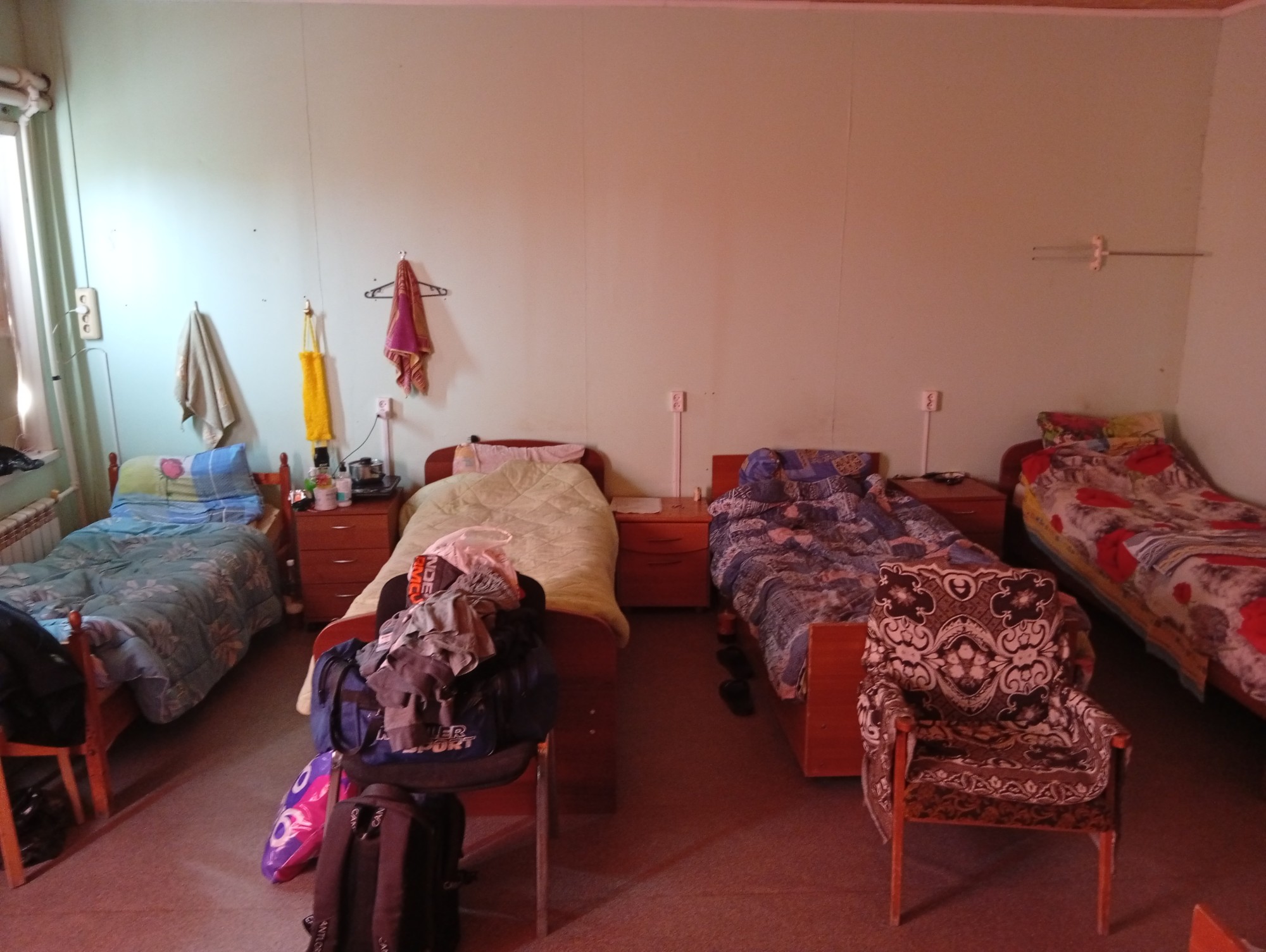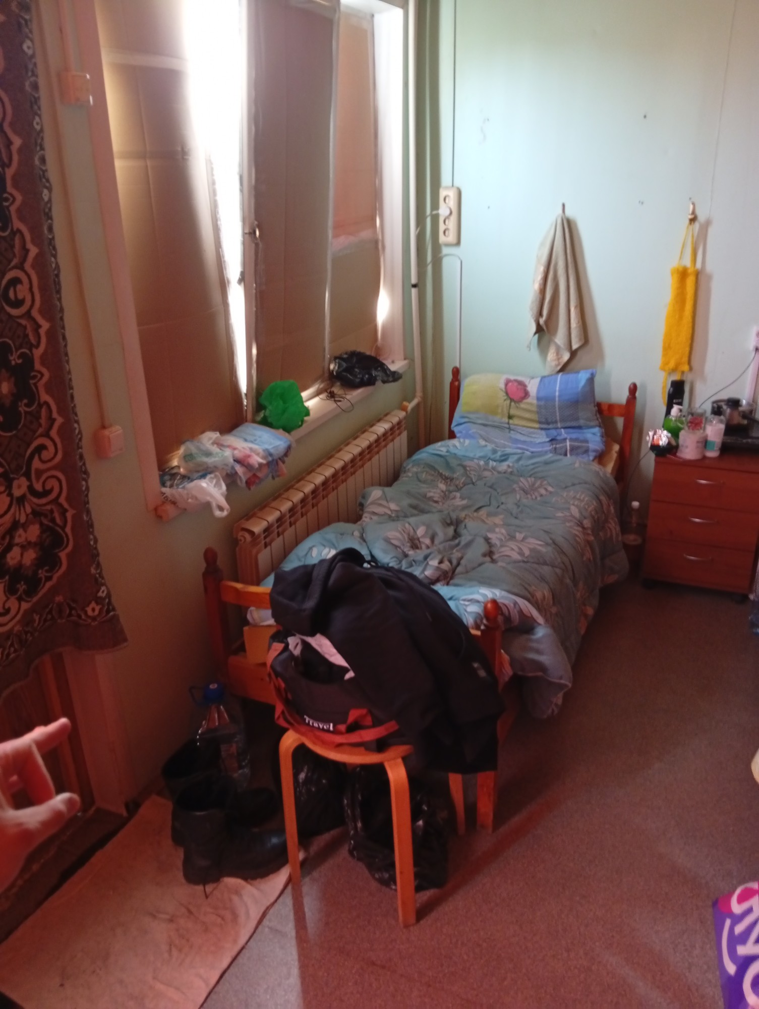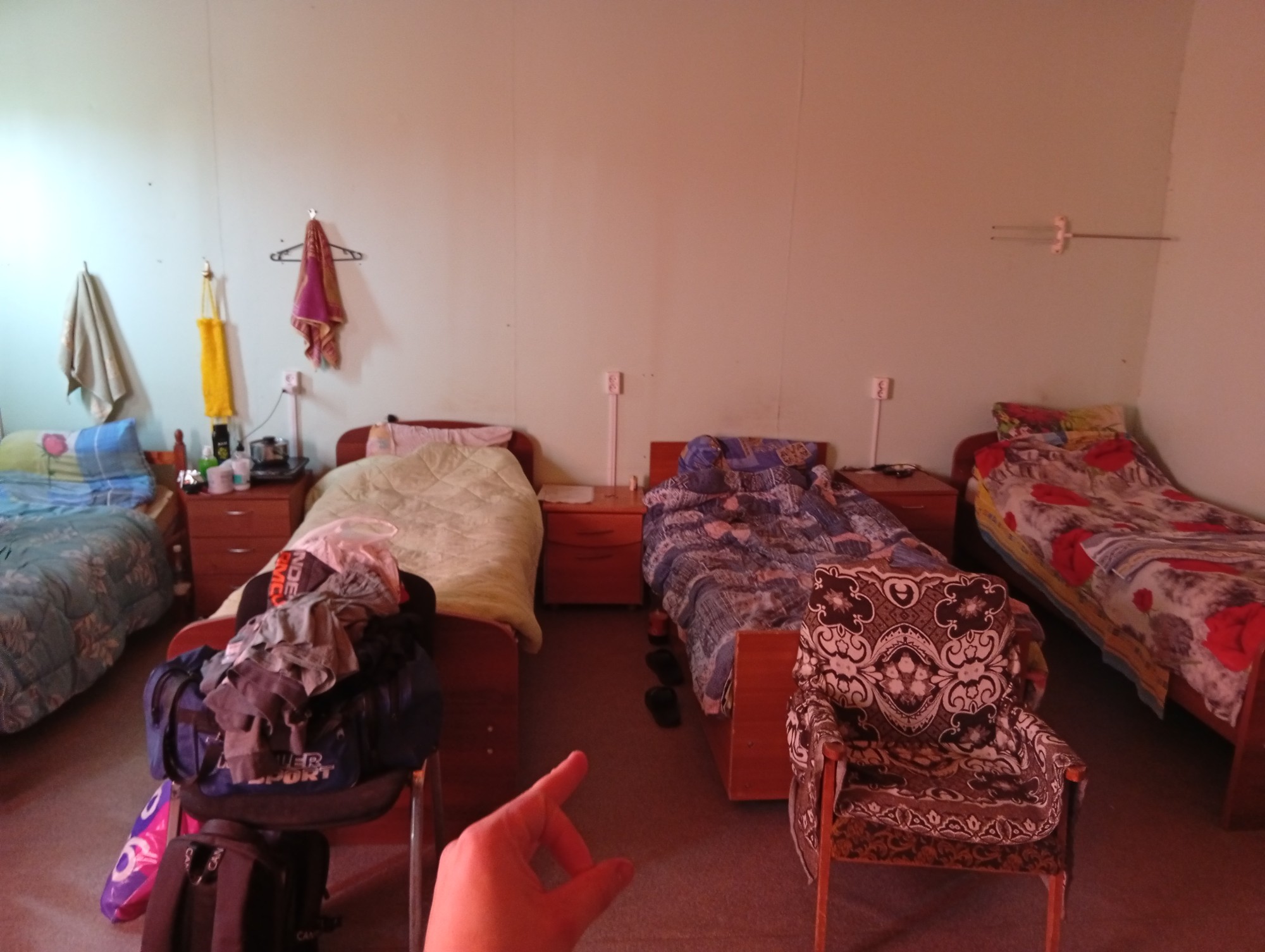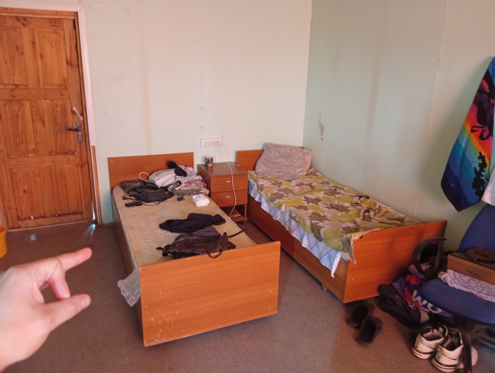 >>946927 это кровать другого чувака, на этой тумбочке кстати плитка и ковшик - его, остальное все мои вещи.